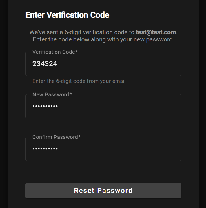 From here, you should recieve an email with a 6 digit verification code, enter this code along with your desired password on the website and click "Reset Password".